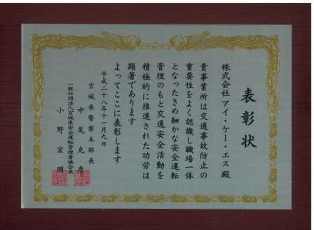 当社の交通安全活動について宮城県警察本部長様と宮城県安全運転管理者協会長様より表彰状を頂戴いたしました。 これを励みに、なお一層交通安全活動へ積極的に取り組み、社内だけでなく地域の交通安全へ貢献出来ますよう、今後も頑張っていきたいと思います。