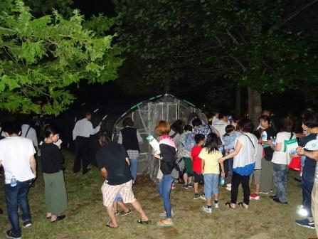 7月13日(金)に石巻浄化センターでホタル観賞会を開催しました。6月26日より当浄化センターのホタルハウスでヘイケボタルが羽化し、7月5日に10匹を超えるホタルの飛翔が確認できたので、市民の皆様をお招きしました。参加者は新聞広告の影響もあり小さいお子様からご年配の方々まで350名となり「ホタルを初めてみました!」「ホタルの光が綺麗で感動しました!」という感想をいただきました。今年で2回目となる観賞会でしたが、この活動を皆様に喜んでいただければ幸いです。