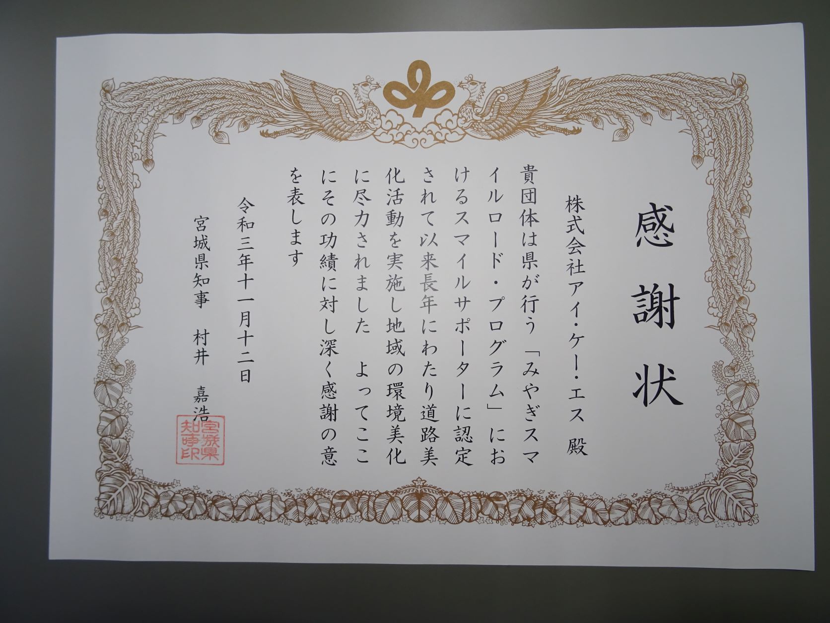 弊社が2008年から行っている「みやぎスマイルロードプログラム」の活動で宮城県知事様より2回目の感謝状を頂戴いたしました。これを励みに、今後もなお一層地域の環境美化に貢献出来ますよう努めてまいります。