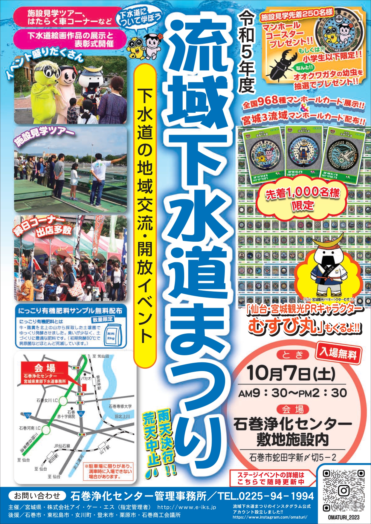 10月7日(土)9時30分から石巻浄化センター施設敷地内において第11回流域下水道まつりを開催いたします。4年ぶりとなる当イベントでは、全国968種のマンホールカードを一堂に展示するほか、宮城3流域のマンホールカードをセットで1,000名様にプレゼントいたします!普段入ることのできない下水道施設の見学では、見学者先着250名様にマンホールコースターか、小学生以下限定でクワガタの幼虫をプレゼント!出店やステージイベント、お子様が楽しめるコーナーも満載です!皆様のご来場を心よりお待ちしております。イベント情報など随時更新いたしますのでインスタグラム公式ページもぜひご覧ください。