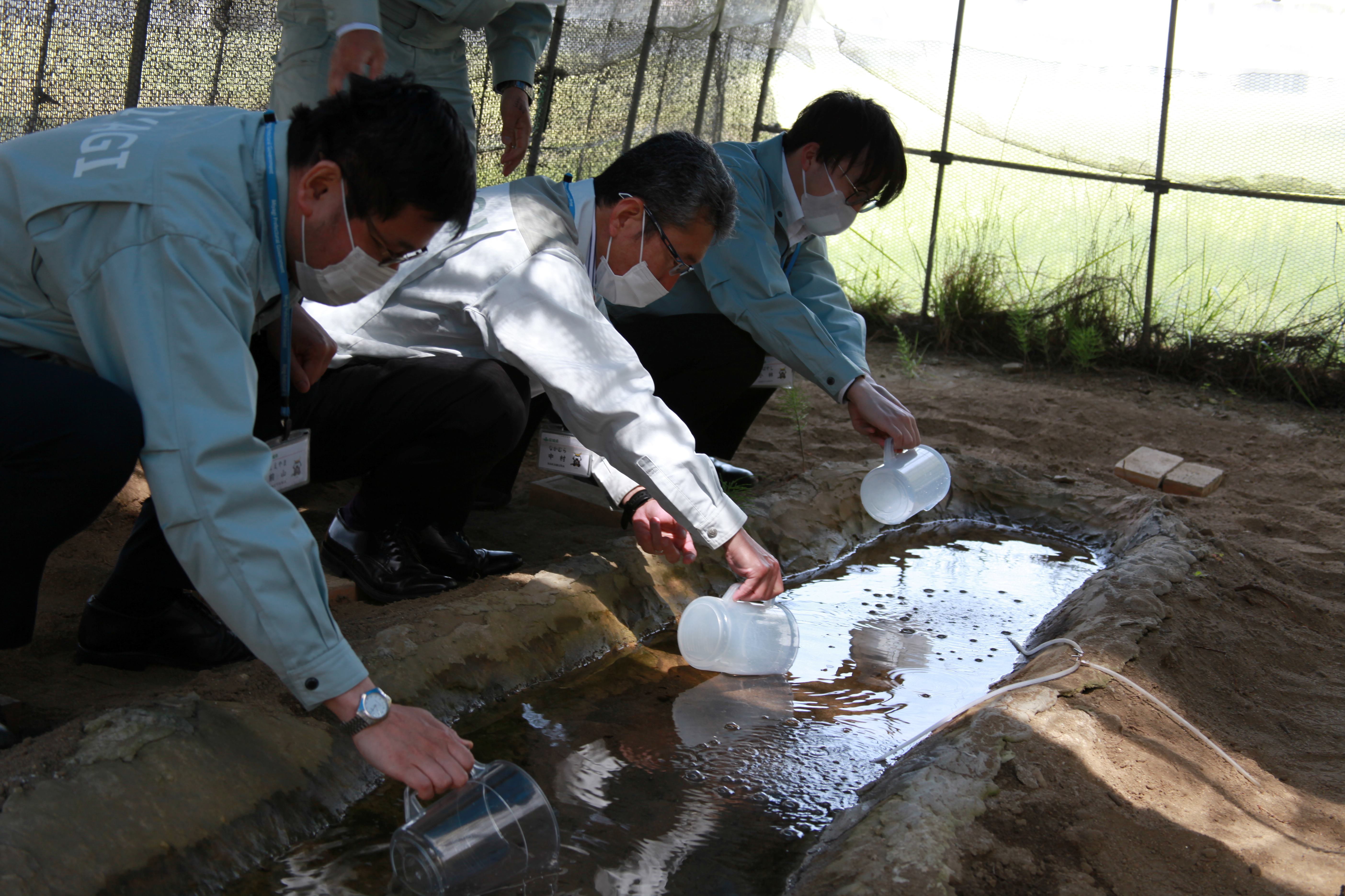当社が管理を受託している石巻浄化センターで、5月1日にホタルの幼虫の放流式を行いました。浄化センターに設置したハウス内の水路に、ヘイケボタル80匹の幼虫を放流しました。今後は5月末までに1,000匹を放流し、様子を見ながらタニシ等の餌を補充していきます。ホタルの飼育は平成25年3月から行っており、平成29年からは飛翔数が増え、近隣の皆様をお招きして鑑賞会を開催できるようになりました。非常に飼育の難しいホタルですが、今年も皆様をお招きできるよう、より多くのホタルの飛翔を目指して飼育に取り組み、下水道施設のPRにつなげていきたいと考えています。