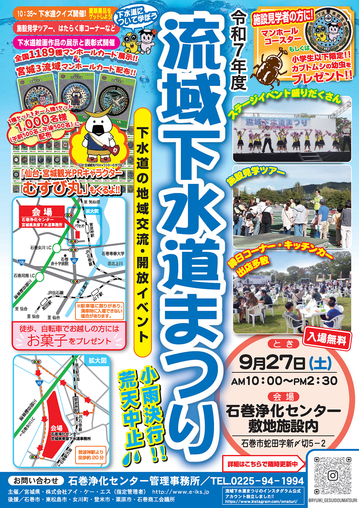 9月27日(土)10時00分から石巻浄化センター施設敷地内において第13回流域下水道まつりを開催いたします。当日は、全国1,189種のマンホールカードを一堂に展示するほか、宮城3流域のマンホールカードをセットで1,000名様にプレゼントいたします!普段入ることのできない下水道施設の見学では、見学者にマンホールコースターか、小学生以下限定でカブトムシの幼虫をプレゼント!出店やステージイベント、お子様が楽しめるコーナーも満載です!皆様のご来場を心よりお待ちしております。イベント情報など随時更新いたしますのでインスタグラム公式ページもぜひご覧ください。